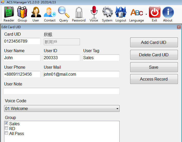 ACS Manager is designed for easy and quick establishing a simple access control system linking to the database. It can be used to manage ACS readers and card UIDs’ access right. All settings are saved in MySQL database. Reader Sync program will publish the settings to ACS readers and read back the access records.