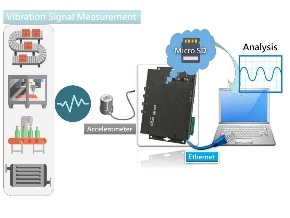 The AR-200/AR-400 series is a range of high-performance dynamic signal acquisition modules that are designed specifically for vibration monitoring and analysis. The maximum simultaneous sampling rate for each channel on the AR-200 and AR-400 is up to 200k-Hz and 125k-Hz respectively. The AR-200/AR-400 modules include a built-in 3mA excitation current to power the Integrated Electronics Piezo-Electric (IEPE) accelerometers and a 16-bit A/D converter. The data acquired by the AR-200/AR-400 is saved on a Micro SD card that can be used for offline vibration analysis. ICP DAS also provides a utility that can be installed on the Host PC that can be easily configured for different triggering modes, as well as changing the sampling rate, and scheduling the sampling time for various applications using the development tools. Consequently, the AR-200/AR-400 modules are recommended as your best choice for vibration monitoring and measurement.