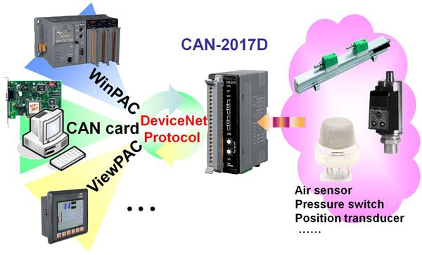 DeviceNet is one kind of the network protocols based on the CAN bus and mainly used for the embedded network of the machine control, such as industrial machine control , aircraft engines monitoring, factory automation, medical equipments control, remote data acquisition, environmental monitoring, and packaging machines control, etc. The CAN-2017D follows DeviceNet specification Volume I/II, Release 2.0. User can access the analog input status and set the configuration via DeviceNet EDS file. CAN-2017D has 8-channel analog input and it can be used to various applications. By the DeviceNet masters of ICP DAS, you can quickly build a DeviceNet network to approach your requirements. For more information about the DeviceNet master interfaces and other DeviceNet products, please refer to the following web site.