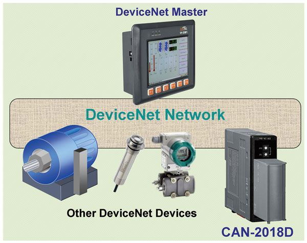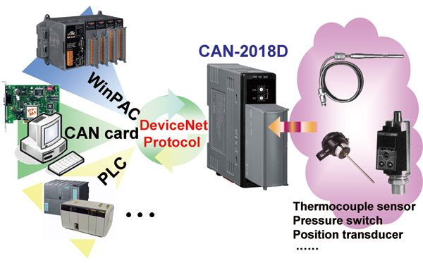 DeviceNet is one kind of the network protocols based on the CAN bus and mainly used for the embedded network of the machine control, such as industrial machine control , aircraft engines monitoring, factory automation, medical equipments control, remote data acquisition, environmental monitoring, and packaging machines control, etc. The CAN-2018D follows DeviceNet specification Volume I/II, Release 2.0. User can access the thermocouple input status and set the configuration via DeviceNet EDS file. CAN-2018D has 8-channel thermocouple input and it can be used to various applications. By the DeviceNet masters of ICP DAS, you can quickly build a DeviceNet network to approach your requirements. For more information about the DeviceNet master interfaces and other DeviceNet products, please refer to the following web site.