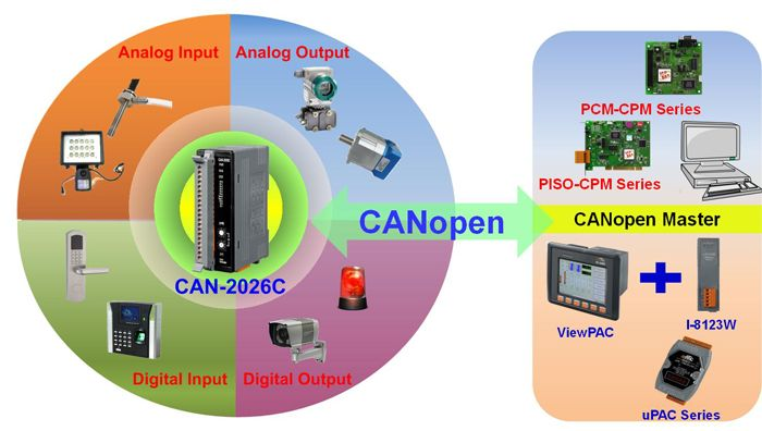 CAN-2026C module follows the CiA-301 version 4.02 and CiA-401 version 2.1. You can access the analog/digital I/O status and set the configuration by using standard CANopen protocol. CAN-2026C has passed the validation of the CiA CANopen conformance test tool. Therefore, you can use it with standard CANopen master easily by applying the EDS file. CAN-2026C has 6 analog input channels, 2 analog output channels, 2 digital input channels and 1 digital output channel. By owing to the CANopen masters of ICP DAS, you can quickly build a CANopen network to approach your requirements. For more information about the CANopen master interfaces and other CANopen products, please refer to the following web site, please refer to the following web site.