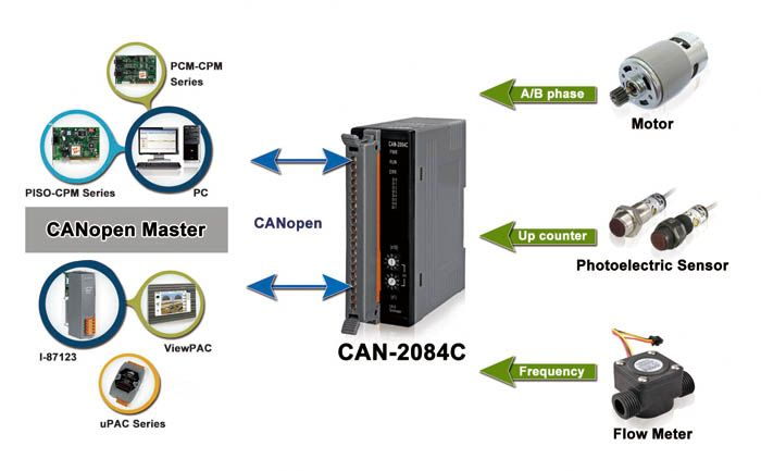 CANopen is one kind of the network protocols based on the CAN bus and mainly used for embedded network of machine control, such as industrial machine control , aircraft engines monitoring, factory automation, medical equipments control, remote data acquisition, environmental monitoring, and packaging machines control, etc. CAN-2084C module follows the CiA-301 version 4.02. CAN-2084C has passed the validation of the CiA CANopen conformance test tool. Therefore, you can use it with standard CANopen master easily by applying the EDS file. The CAN-2084C is a 4/8-channel Counter/Frequency module that provides “Up Counter”, "Frequency”, “Up/Down Counter”, “Dir/Pulse Counter” and “A/B Phase Counter” modes. It provides a variety of measurement applications, such as measuring a number of time-related quantities, counting events or totalizing and monitoring position with quadrature encoders. In addition, a digital filter is used to eliminate the effects of noise. By owing to the CANopen masters of ICP DAS, you can quickly build a CANopen network to approach your requirements. For more information about the CANopen master interfaces and other CANopen products, please refer to the following web site.