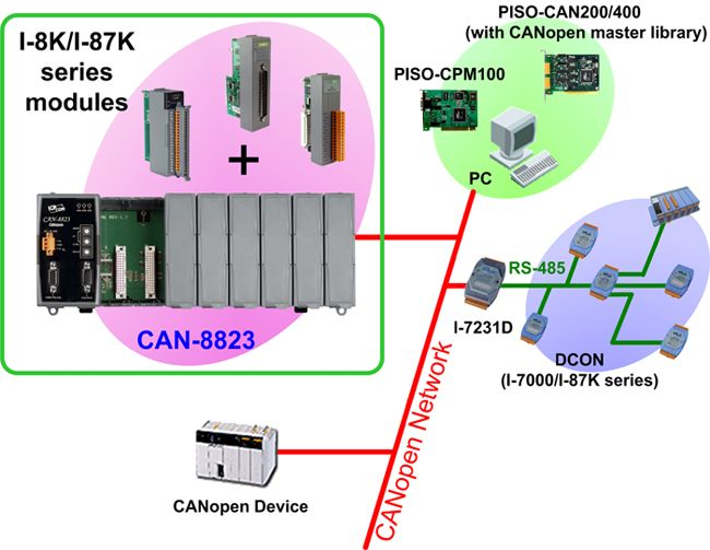 CAN-8823 main control unit is specially designed for the slave device of CANopen protocol. It follows the CANopen Spec DS-301 V4.02 and DSP-401 V2.1, and supplies many features for users, such as dynamic PDO, EMCY object, error output value, SYNC cyclic and acyclic, … and etc. In order to expand I/O channel more flexible, an CAN-8823 supports up to 8 slots for I/O expansion and suits with a lot of ICP DAS DI / AI / DO / AO modules. User can choose DI/DO/AI/AO modules of I-87K series or I-8000 series to fit the customized practice applications. In addition, we also provide CAN-8823 Utility to allow users to create the EDS file dynamically. The EDS file is based on CANopen DSP-306 and can be compatible with different CANopen master interfaces. The application architecture is as follows.