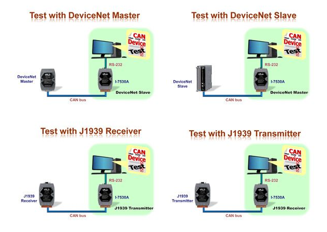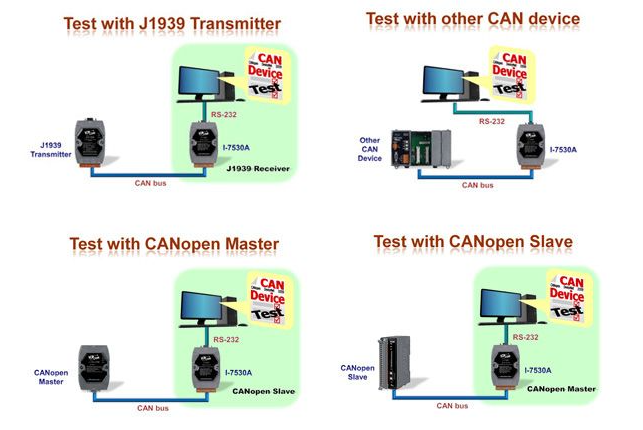 The CAN test tool can help users to test the CAN communication of CAN series of ICP DAS by the simple steps. This tool is based on VxCAN driver and supports most of all CAN products of ICP DAS. You can use these devices to be an simple CANopen master, CANopen slave, DeviceNet master, DeviceNet slave, J1939 transmitter or J1939 receiver to test the DUT (device under test). It can easily and quickly test if the DUT works well or not. Only three simple steps, you can finish the test of these devices.