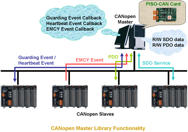 The library provides the CANopen Master mechanism to communicate with slave devices by the SDO, PDO, SYNC, EMCY, NMT and NMT Error Control protocol. Besides, the library supports user-defined event routines such as EMCY, Slave Boot up message and NMT Error Control protocol and users can program self's process for these important events.