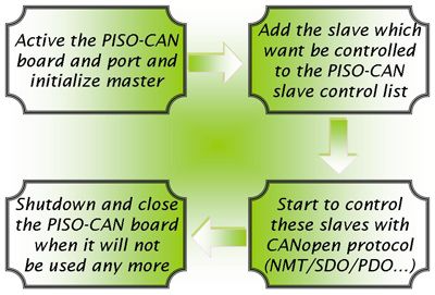 The CANopen communication protocol is based on the Master-slave model. Master should create communication services such as SDO, PDO, and NMT for slave devices to exchanging information and I/O data. To establish master control mechanism, there are only four main steps to be followed.