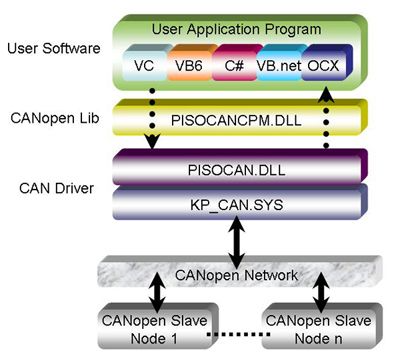 The user's CANopen application programs can be developed by the following designated tools: VC, VB6, C#, VB.net, OCX, etc. In these tools, the application program can call the PISOCANCPMM.DLL driver to implement CANopen network application.