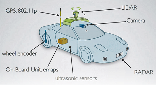 Bộ cảm biến cần thiết cho việc lái xe tự động thông thường bao gồm một máy GPS cao cấp, nắp đậy (phát hiện ánh sáng và phạm vi), một hoặc nhiều máy quay video, radar và sonar. Chiếc xe cũng cần ít nhất một máy tính rất mạnh.