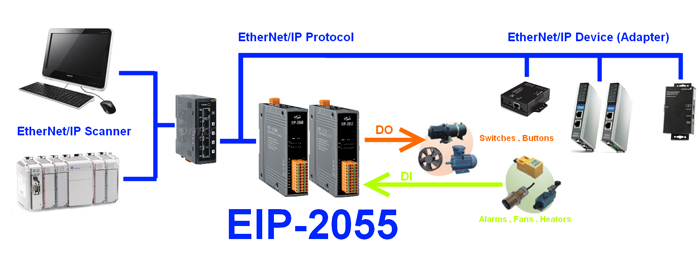 The EIP-2000 is an industrial remote I/O module series supporting the EtherNet/IP protocol. Users can seamlessly integrate these modules into the Ethernet network from the industrial floor to the enterprise. The EIP-2000 allows daisy chain connection which permits the flexibility in locating devices, eases installation and lowers infrastructure costs. All the modules can be deployed in the network topologies such as star, line or ring. The isolation design protects the EIP-2000 against the harmful interference. The EIP-2055 is a remote digital I/O module with 8 inputs and 8 outputs. It is designed as an EtherNet/IP adapter. Users can obtain the I/O status as well as the connection status of the EIP-2055 by the LEDs. In addition, ICPDAS provides software utility to easily configure and test the EIP-2000 modules via Ethernet.