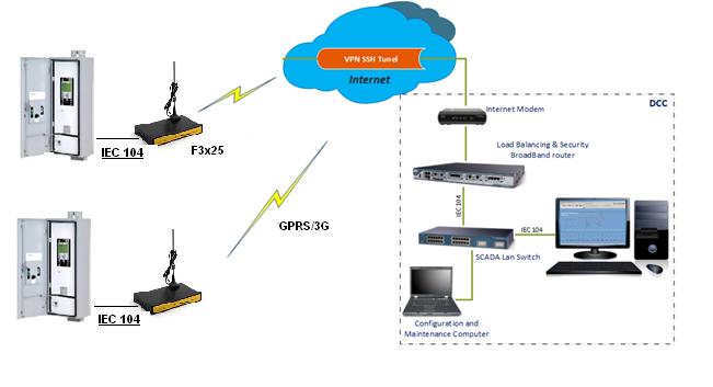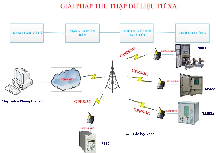 - Mô hình giải pháp sử dụng đường truyền mạng di động: Recloser ( hỗ trợ IEC101/104) -> Modem IP GPRS/3G/Router -> Sim 3G -> Internet -> Switch mạng -> Máy tính điều độ trung tâm.