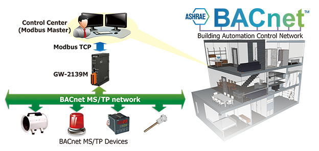 GW-2139M is a network gateway allowing Modbus TCP client devices to be accessed BACnet MS/TP network as a BACnet MS/TP master. The BACnet Master Slave Token Passing (MS/TP) protocol is used to relay and exchange information between building devices. GW-2139M contains a large number of BACnet objects (AI, AO, AV, BI, BO, BV, MSI, MSO, MSV) gives you flexibility in mapping Modbus TCP registers to any combination of BACnet objects. BACnet interoperability building blocks (DS-RP-A, DS-RPM-A, DS-WP-A, DS-WPM-A, DM-DDB-A, DM-DOB-A, DM-DCC-A, DM-RD-A) are Supported. All the data transfer is configurable using ICPDAS Utility.