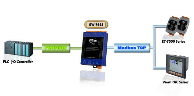 The GW-7663 specially designed for PROFINET IO device. It allows PROFINET controller to access Modbus TCP devices. These Modbus devices maybe a PLC, a sensor, ICPDAS I-8KE4-MCTP, ET-7000 series modules and so forth. We also provide a utility software for users to configure GW-7663. By using this module, users can put their Modbus devices into PROFINET network easily.