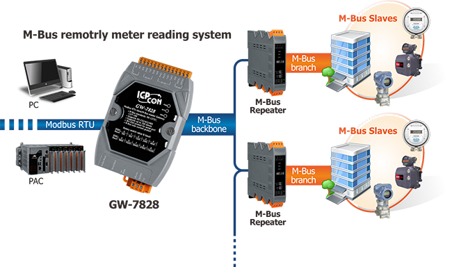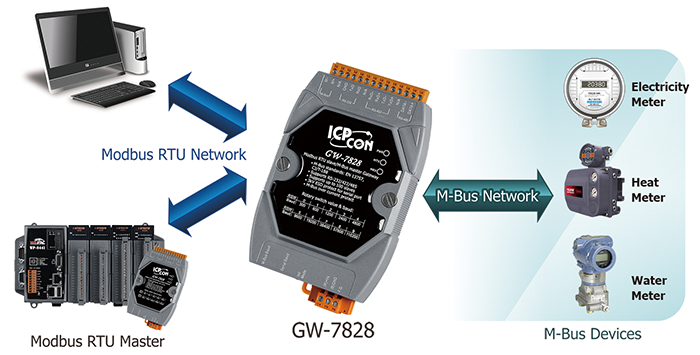 The M-Bus ("Meter-Bus") is a standard for remote reading of meters. It is usable for most types of consumption meters as well as for various sensors and actuators. The GW-7828 is specially designed for M-Bus slave device. It offers Modbus RTU communication by three kinds of interface, RS-232, RS-422 and RS-485. On hardware the GW-7828 has two rotary switches for serial port and M-Bus port baud rate. GW-7828 supports Modbus RTU function code 0x03 and 0x04 to read data of M-Bus meters. Through this design, it is easy to communicate with any standard M-Bus slave.