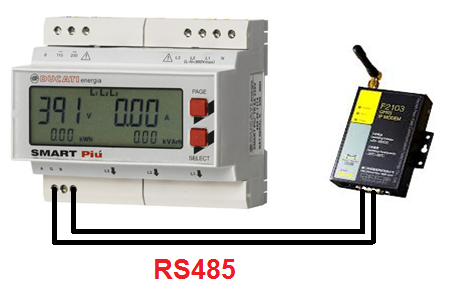 - Do đồng hồ Ducati và modem F2103 đều hỗ trợ chuẩn truyền thông RS485, nên tại hiện trường, ta sẽ kết nối đồng hồ Ducati và Modem qua 02 dây tín hiệu 485 như hình vẽ.