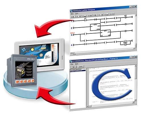 HMIWorks supports “Standard C” for users of programmer and "Ladder Designer" for user of PLC. These two program can be used alone or in combination.“Standard C” also provides a rich TCP/IP and Uart API, allowing users to develop private communication protocols for devices that are not using standard Modbus protocols.