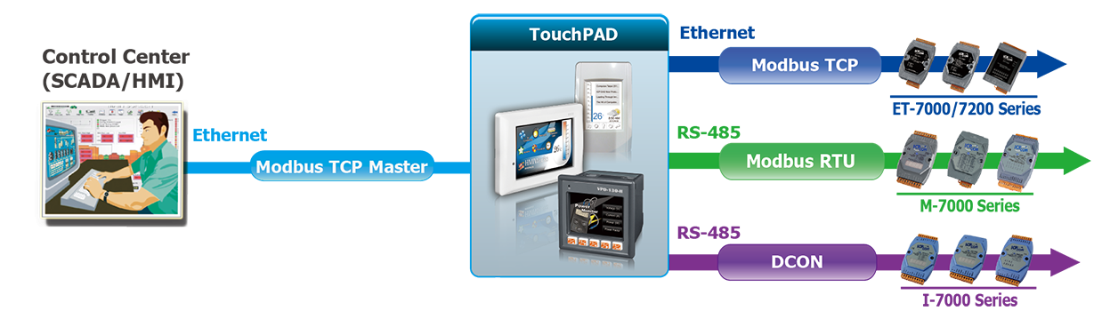 TouchPAD is equipped with RS-232/422/485 or Ethernet communication interfaces. It is easy to control various remote IO modules with standard Modbus TCP/RTU or DCON protocols, and some models support XV-board for local I/O expansion. TouchPAD can also work as Modbus TCP/RTU slave device for easy integration with SCADA software.
