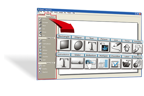 Many widgets are included in the HMIWorks development tool, including Rectangle, Ellipse, Text, Picture, Line, TextPushButton, Slider, BitButton, HotSpot, CheckBox, Label, Timer, PaintBox, ObjectList, providing the most commonlyused functions, such as drawings, event handlers, and timing control, which effectively shortens development time.