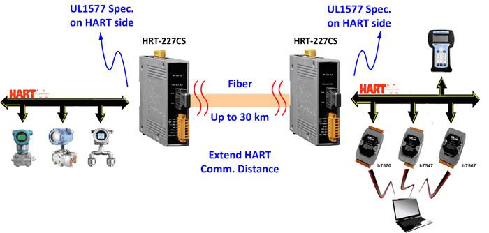 The HRT-227CS is a HART to Fiber converter paired used to extend HART communication distance via single mode fiber optic transmission medium. In order to solve the problem between HART and fiber transmission medium, HRT-227CS is specially designed for converting the HART signal to fiber optic cables. Built-in a HART 250 Ω loop resistor adjustable by dip switch. Therefore, users can make data collection and processing of HART network easier and quicker by applying HRT-227CS. In addition, we also provide the free HC_Tool utility for module configuration easily.