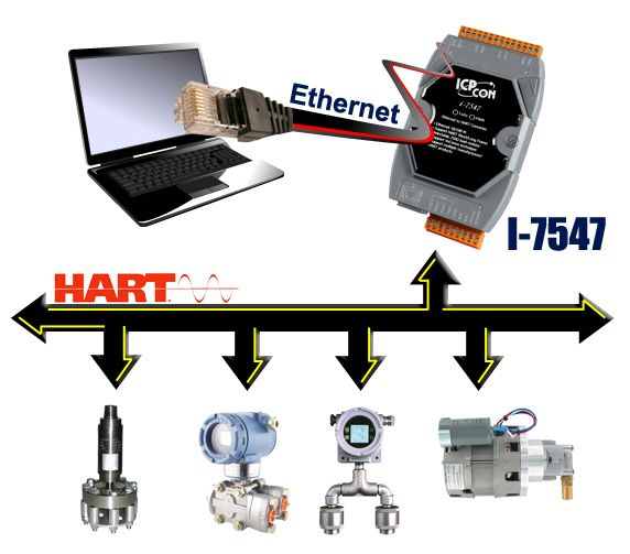 I-7547 is an Ethernet to HART converter and can be used as a HART master with HC_Tool utility or a HART slave with HDS utility.