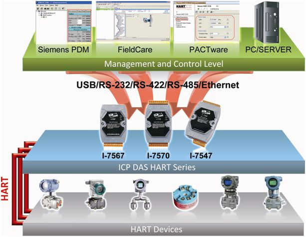 FDT (Field Device Tool) standardizes the communication and configuration interface between all field devices and host systems. FDT provides a common environment for accessing the devices' most sophisticated features. Therefore, by using ICPDAS HART converters, I-7567, I-7570 or I-7547, supporting FDT, users can easily and quickly construct HART online control and configuration system.