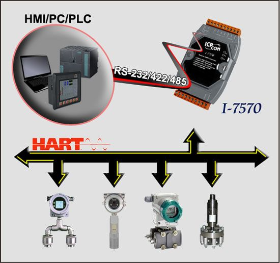 I-7570 is a Serial to HART converter and can be used as a HART master with HC_Tool utility or a HART slave with HDS utility.