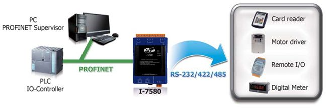 The I-7580 is a PROFINET IO device with RT functionality that supports RS-232, RS-422 and RS-485 serial interfaces. Users can choose one of these serial communication interfaces to apply. It is easy to allow users to take almost serial device to a PROFINET network including serial remote I/O devices, sensors, actuators, HMI, barcode readers and RFID, etc