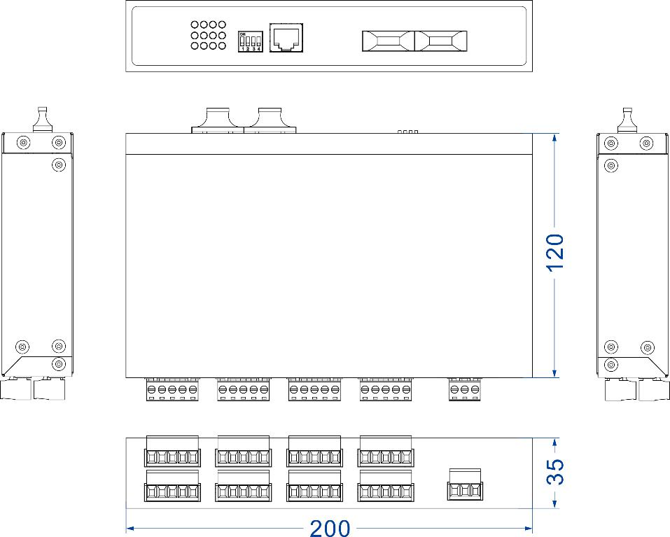 Housing: IP30 protection, metal Installation: wall mounting Dimension (W x H x D): 200mm×35mm×120mm Weight: 647g
