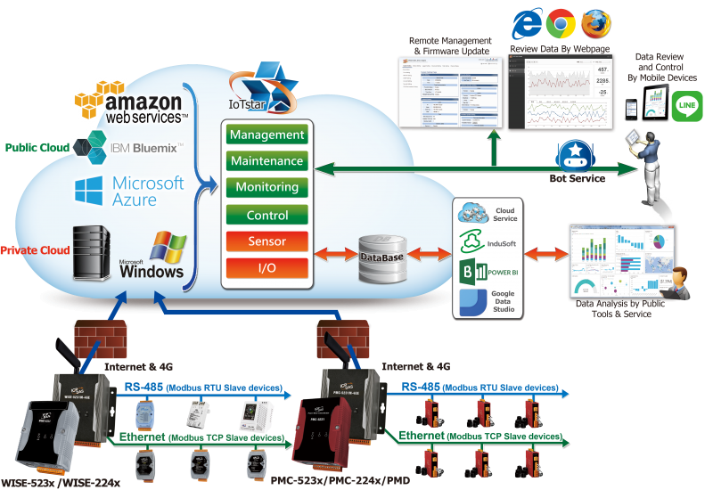 With IoTstar, users can complete the system setting only by a few clicks on Web page, and perform the Remote Access (Status Monitoring, System Setting, and Firmware Update) and Data Service (Sensor data collected and imported into Database) operations for each WISE/PMC/PMD. Through the SQL database command, IoTstar can be quickly integrated with the Cloud platforms, data analysis tools (Power BI, Google Data Studio, etc.) or SCADA systems to help users quickly build the Cloud "IoT + Big Data" application and significantly reduce the time and cost for the implementation of Cloud "IoT + Big Data" application.