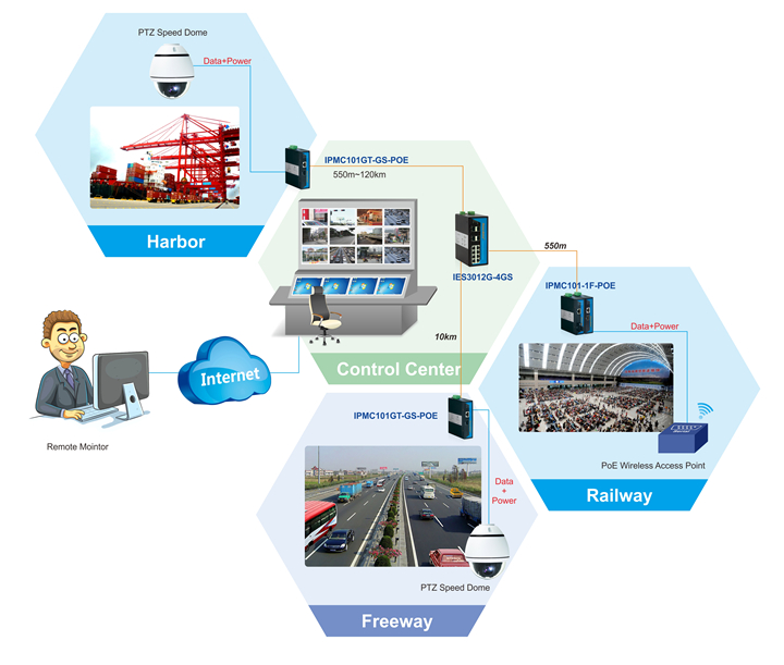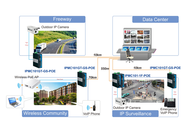The IPMC101GT-GS-POE device is a kind of industrial Gigabit PoE media converter, it support 1 10Base-T/100Base-TX/1000 Base-TX port and 1 1000Base-X SFP port. These converters are classified as power source equipment (PSE), and when used in this way provide up to 30 watts to IEEE802.3af/at compliant powered devices (PDs), eliminating the need for additional wiring. It support LFP function, it is easy to check the network connection status, it also support CE, FCC standard, adopt industry standard design, IP40 protection, rugged high-strength metal case, power supply input(48VDC), -40 to 60°C working temperature. The converters support IEEE802.3/ IEEE802.3u/ IEEE802.3x/ IEEE802.3ab/ IEEE802.3z with 10/100/1000M, full/half-duplex, and MDI/MDI-X auto-sensing, providing a complete solution for your industrial Ethernet network.