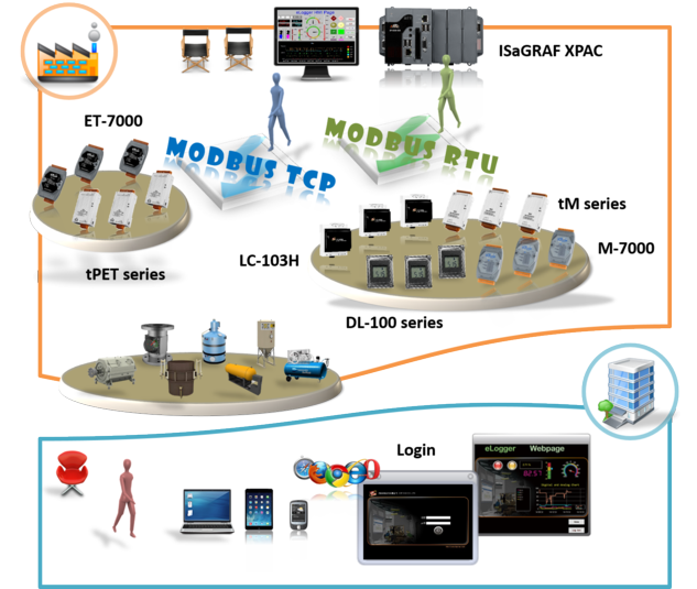 It supports Modbus protocol and can link to distributed I/O modules with Modbus or DCON protocol via the RS-232/485 or Ethernet.