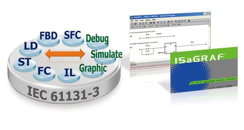 ISaGRAF is the software that supports five of IEC 61131-3 PLC Language, including Sequential Function Chart (SFC)、Quick Ladder Diagram (LD)、Function Block Diagram (FBD)、Structured Text (ST) and Instruction List (IL)five language, it also supports sixth PLC language - Flow Chart (FC). This flexibility enables users to choose the language that best suits their knowledge, style and the nature of the application.