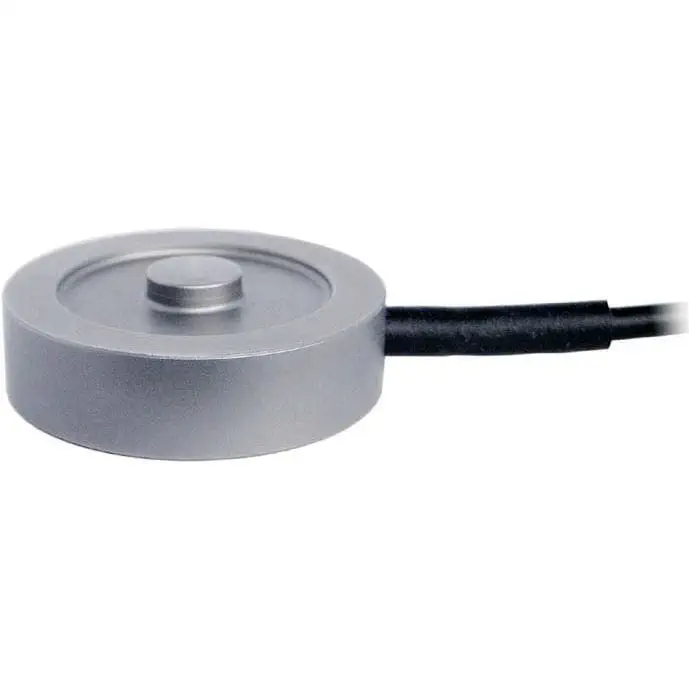The sub-miniature compression load cells are flat, cylindrical with covered bottoms. The load application button for receiving the compression forces is an integrated part of the top, which is the sensor's membrane.The connecting cable of the...