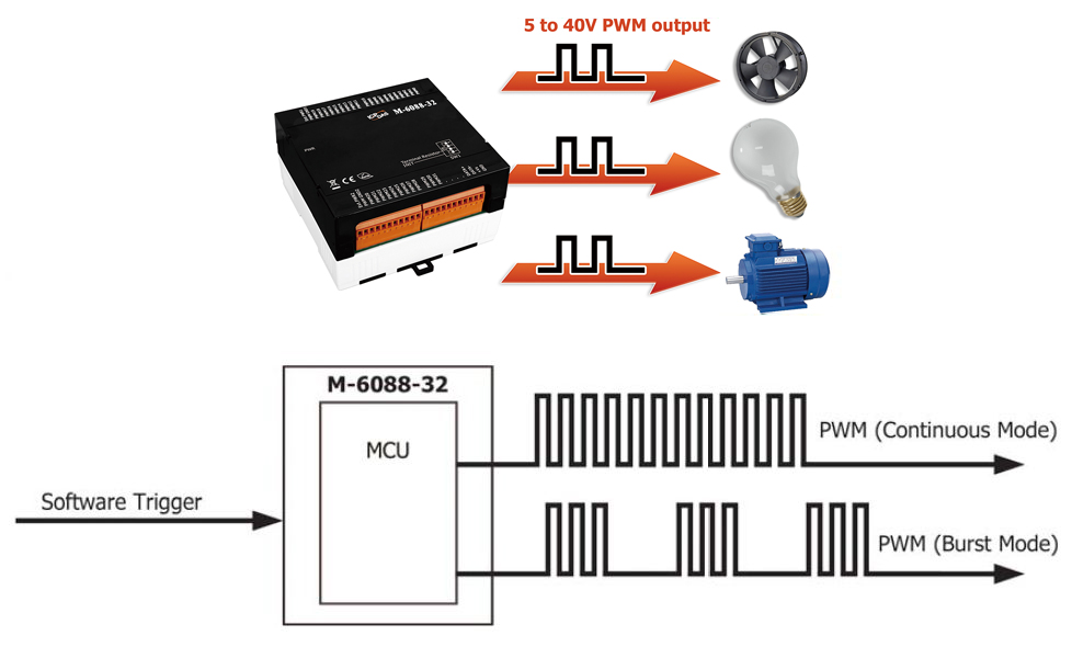 The M-6088-32 provides 32-channel PWM (Pulse Width Modulation) Output, and can be used to develop powerful and cost-effective analog control systems. PWM is a powerful technique for controlling analog circuits that uses the Digital Output to generate a waveform with a variable duty cycle and frequency which can then be used to control an analog circuit in applications such as controlling the position or speed of motors, the brightness of lamps, or the speed of fans, etc. Either burst mode or continuous mode can be used for the PWM output depending on the application. When required, communication with the M-6088-32 can be programmed based on the Modbus RTU and the DCON protocol, with the added benefit that different addresses can be configured via hardware to allow for Modbus RTU communication.