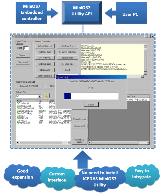 MiniOS7 APIs support programmer to send MiniOS7 command or upload file from host PC. Programmer can integrate APIs into an application to let user set IP, update firmware and so on. User doesn’t need to install ICPDAS MiniOS7 Utility anymore