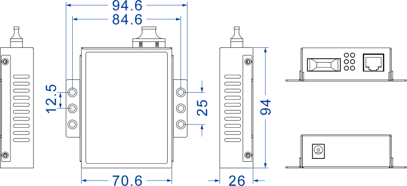 Housing: metal Installation: wall or DIN-Rail mounting Dimension (W x H x D): 70.6mm×26mm×94mm (external power supply) 115mm×30mm×173.2mm (built-in power supply)