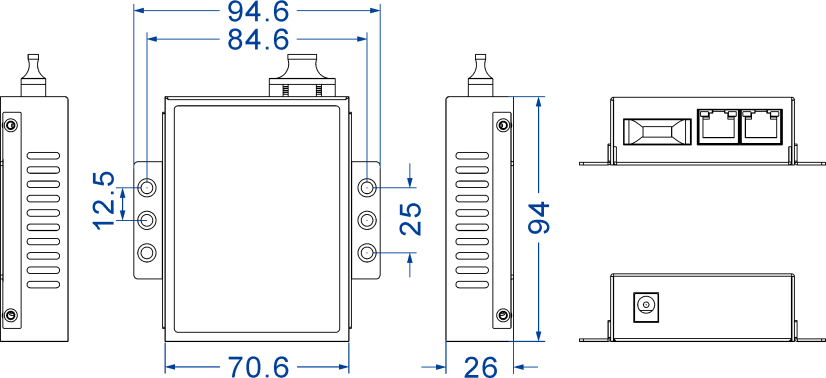 Housing: metal Installation: wall or DIN-Rail mounting Dimension (W x H x D): 70.6mm×26mm×94mm (external power supply) 115mm×30mm×173.2mm (built-in power supply)