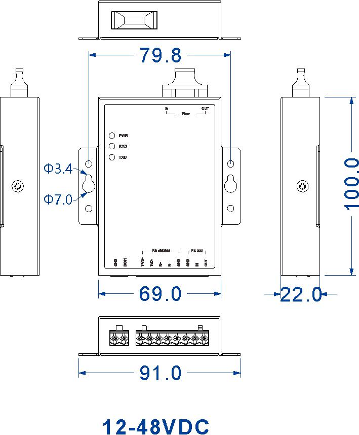 Housing: IP30 protection grade, metal shell Installation: wall mounting or DIN-Rail mounting (DIN-Rail accessories should be purchased separately) MODEL277 dimension (W×H×D): 100mm×69mm×22mm MODEL277A, MODEL277B dimension (W×H×D): External power supply: 94mm×70.6mm×26mm Built-in power supply: 173.2mm×115mm×30mm