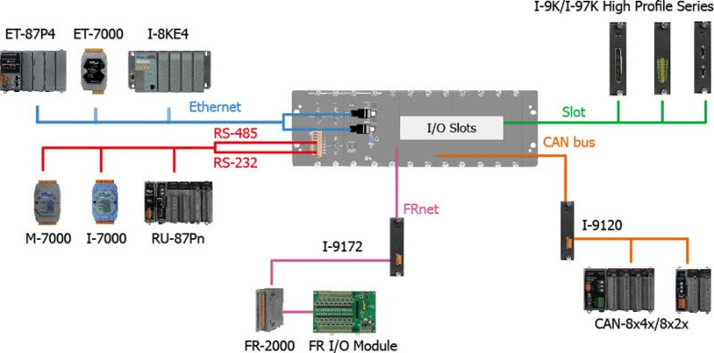 Beside the local I/O slots, XP-9000-IoT also provides several RS-232/RS-485/USB ports and two Ethernet ports to connect with serial/USB I/O and Ethernet I/O devices.