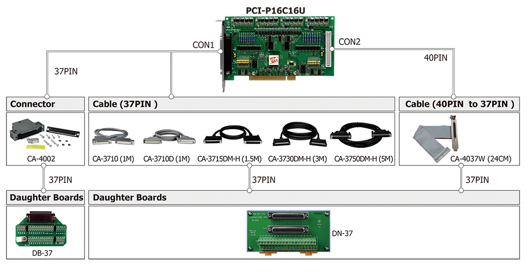 | PCI-P16C16U CR | Universal PCI, 16-ch Isolated Digital Input and 16-ch Open Collector Digital Output Board (Current Sinking, NPN type) (RoHS) Includes one CA-4037W cable and two CA-4002 D-Sub connectors |