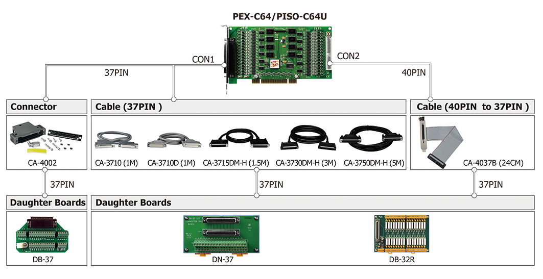 | PEX-C64 CR | PCI Express, 64-ch Open Collector Isolated Digital Output Board (Current Sinking, NPN) (RoHS) Includes one CA-4037B cable and two CA-4002 D-Sub connectors |