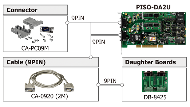 | PISO-DA2U CR | Universal PCI, 2-ch Isolated Analog Output Board (RoHS) Includes two CA-PC09M D-Sub connectors |