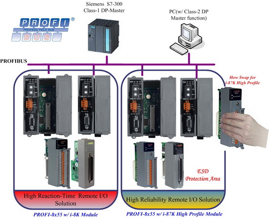 The PROFI-8255 Remote I/O Unit is specially designed for the slave device of PROFIBUS DP protocol. It supports up to 2 slots for ICPDAS I-8k series, I-87k Low Profile series, and I-87k High Profiles series I/O modules. In addition, we also provide hot-swap function for I-87k High Profiles series I/O modules. To setup network, users can choose and configure I/O modules by using the GSD file without any other setting tools.