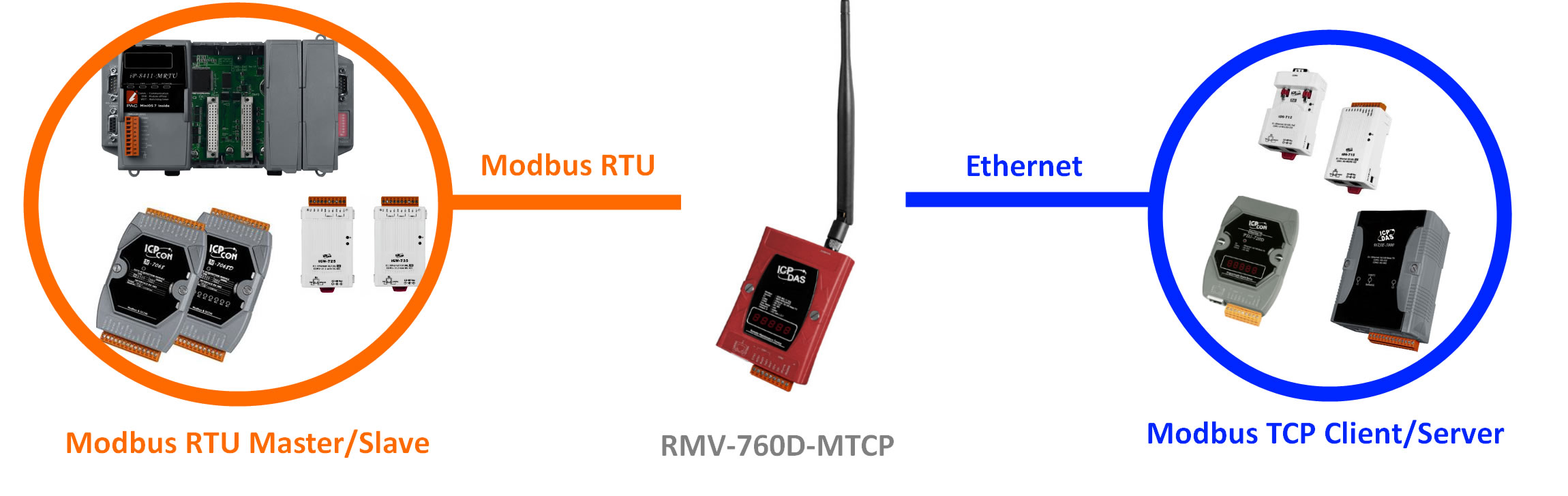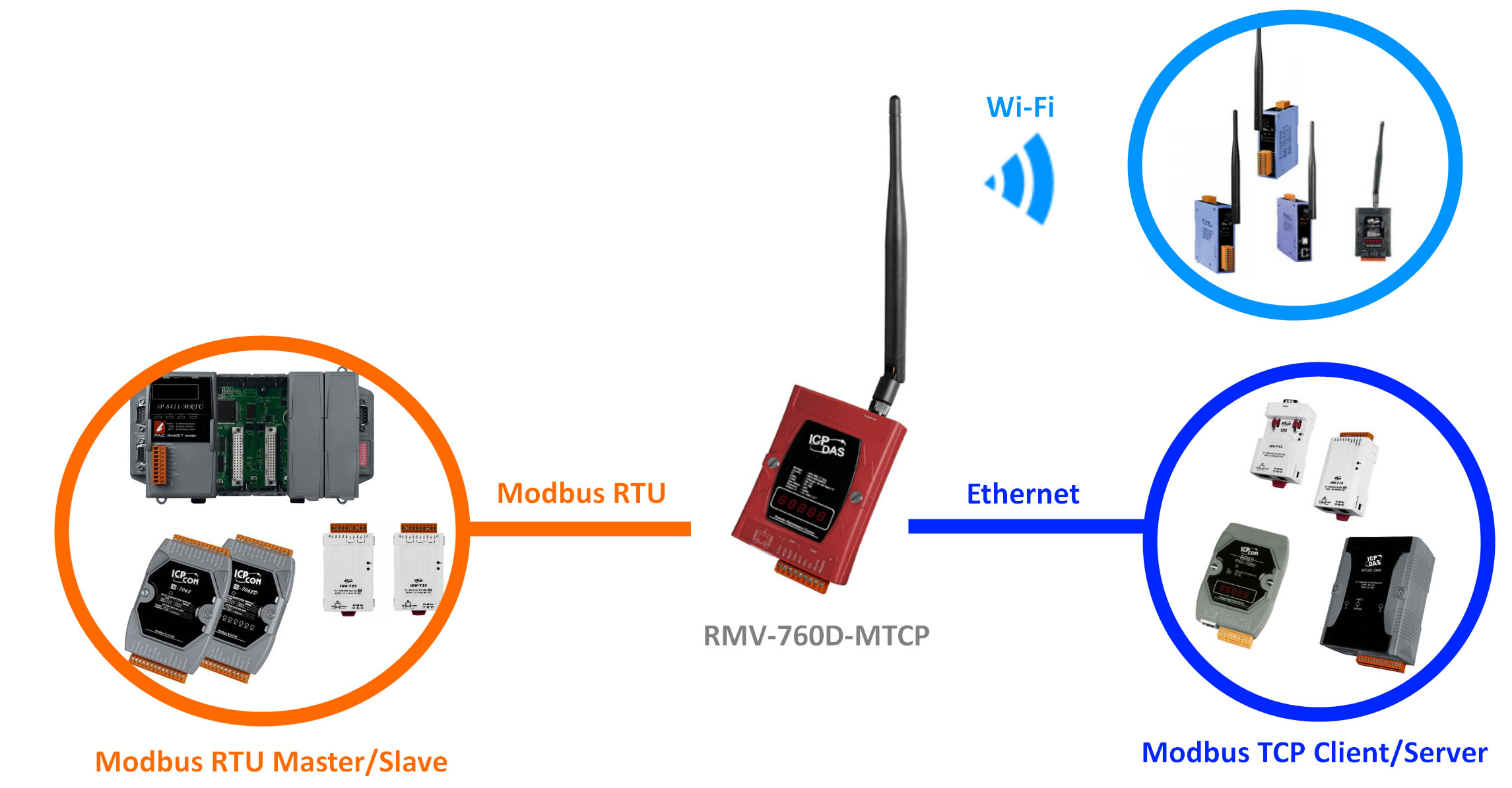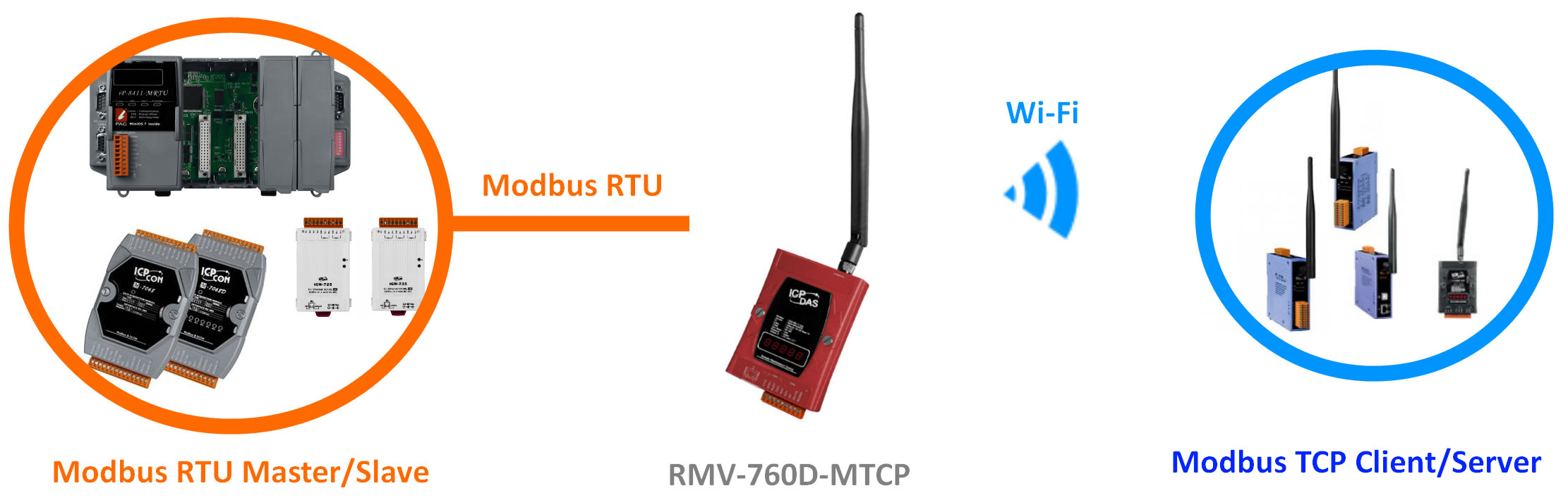 RMV-760D-TCP is a Modbus TCP/RTU gateway. It exchanges Modbus command from Modbus TCP/RTU master to Modbus RTU/TCP slave. Modbus TCP command can be transceived not only Ethernet port but also Wi-Fi interface. It supports VxComm and Pair-Connection functions. Users can choose Ethernet mode or Wi-Fi mode to do the pair connection, which provides TCP data tunneling between two serial devices