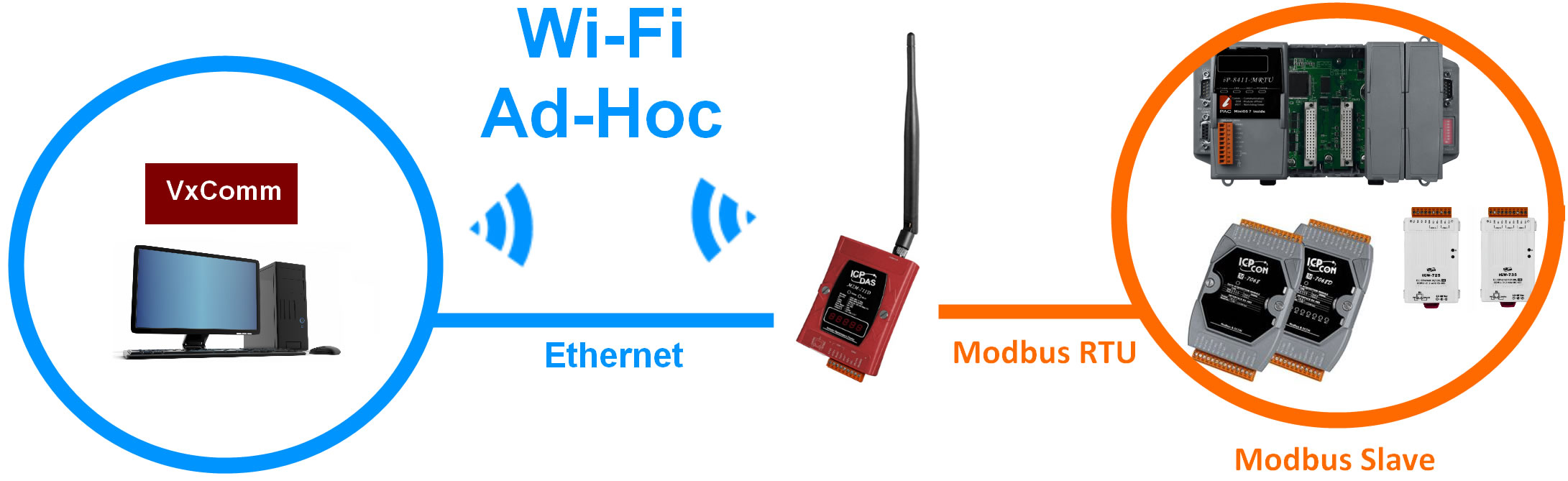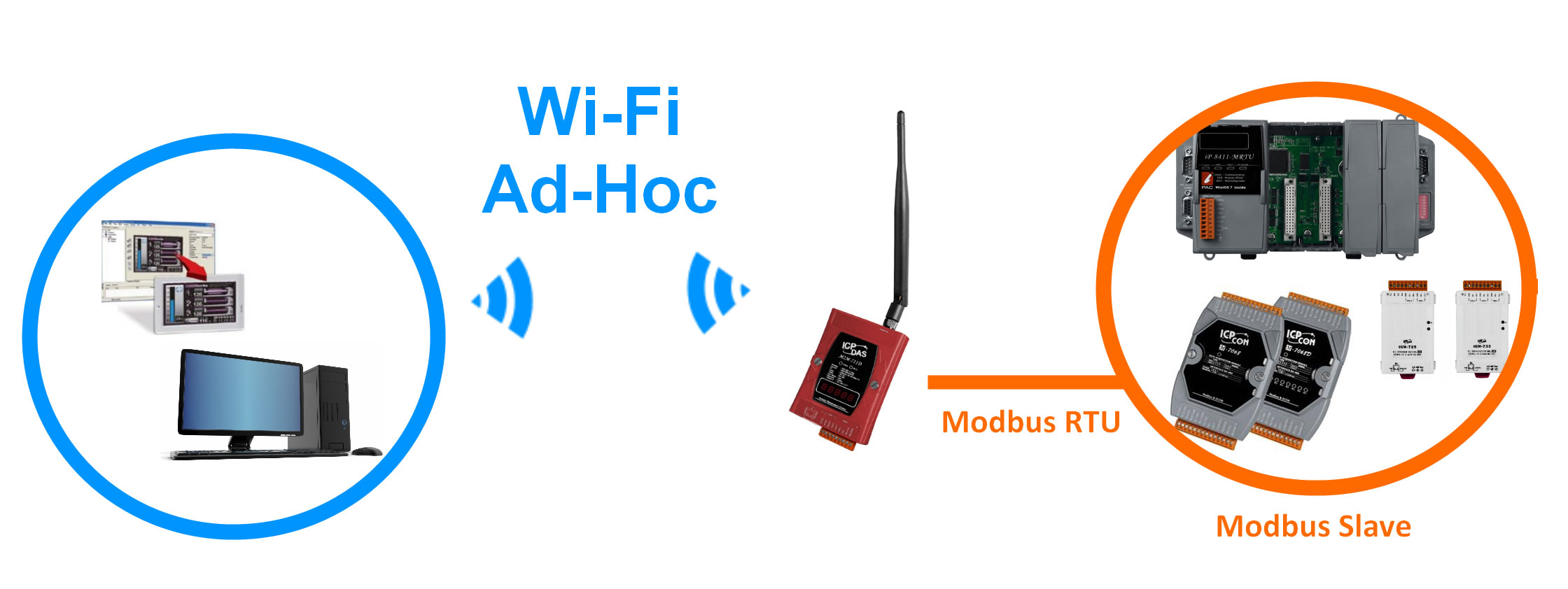 In this mode, if the PC has Wi-Fi Wireless LAN Card, users can make the PC and RMV-760D-MTCP transmit data without Wi-Fi AP and the transmission distances up to 50 meters.