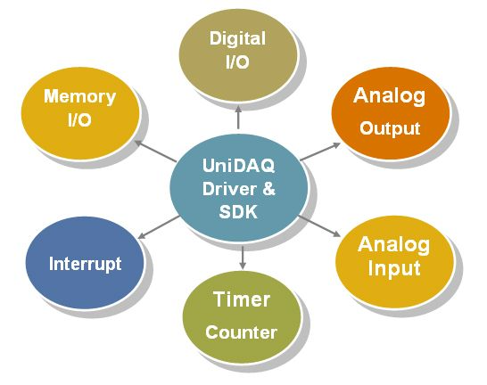 UniDAQ is a uniform SDK interface working on Windows OS to implement common data access functionality on ICP DAS I/O cards. It supports most I/O cards with PCI/Universal PCI bus and the new coming products with PCI Express bus. With the UniDAQ SDK, it is easy to integrate several different kinds of I/O cards in your system, upgrade to new hardware, expand channels in your system and develop numerous applications based on the various I/O cards.