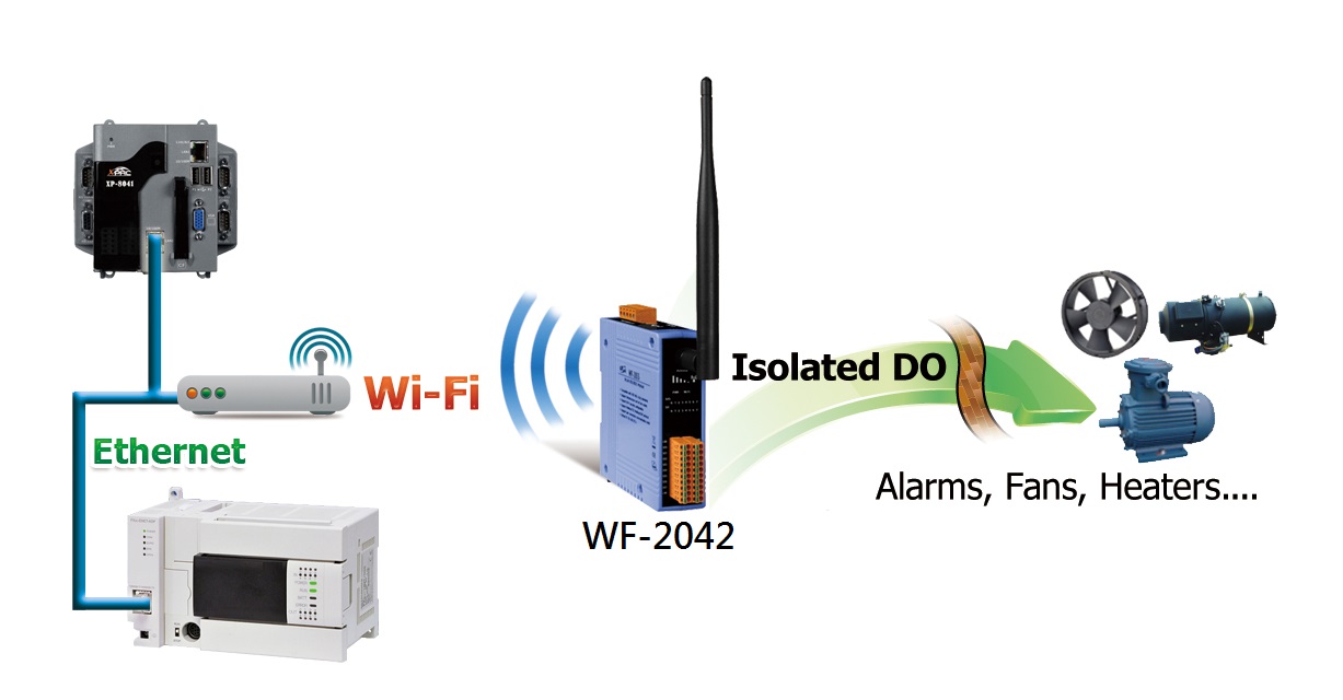 The WF-2042 is a 16-channel isolated digital output module and it is one of the members of the WF-2000 wireless product family. In addition, the WF-2042 has WLAN connection complies with the IEEE802.11b/g standards. With the popularity of 802.11 network infrastructure, the WF-2042 makes an easy way to incorporate wireless connectivity into monitoring and control systems. The WF-2042 also supports Modbus/TCP and UDP protocols and the network encryption configuration, which makes perfect integration to SCADA software and offer easy and safe access for users from anytime and anywhere.