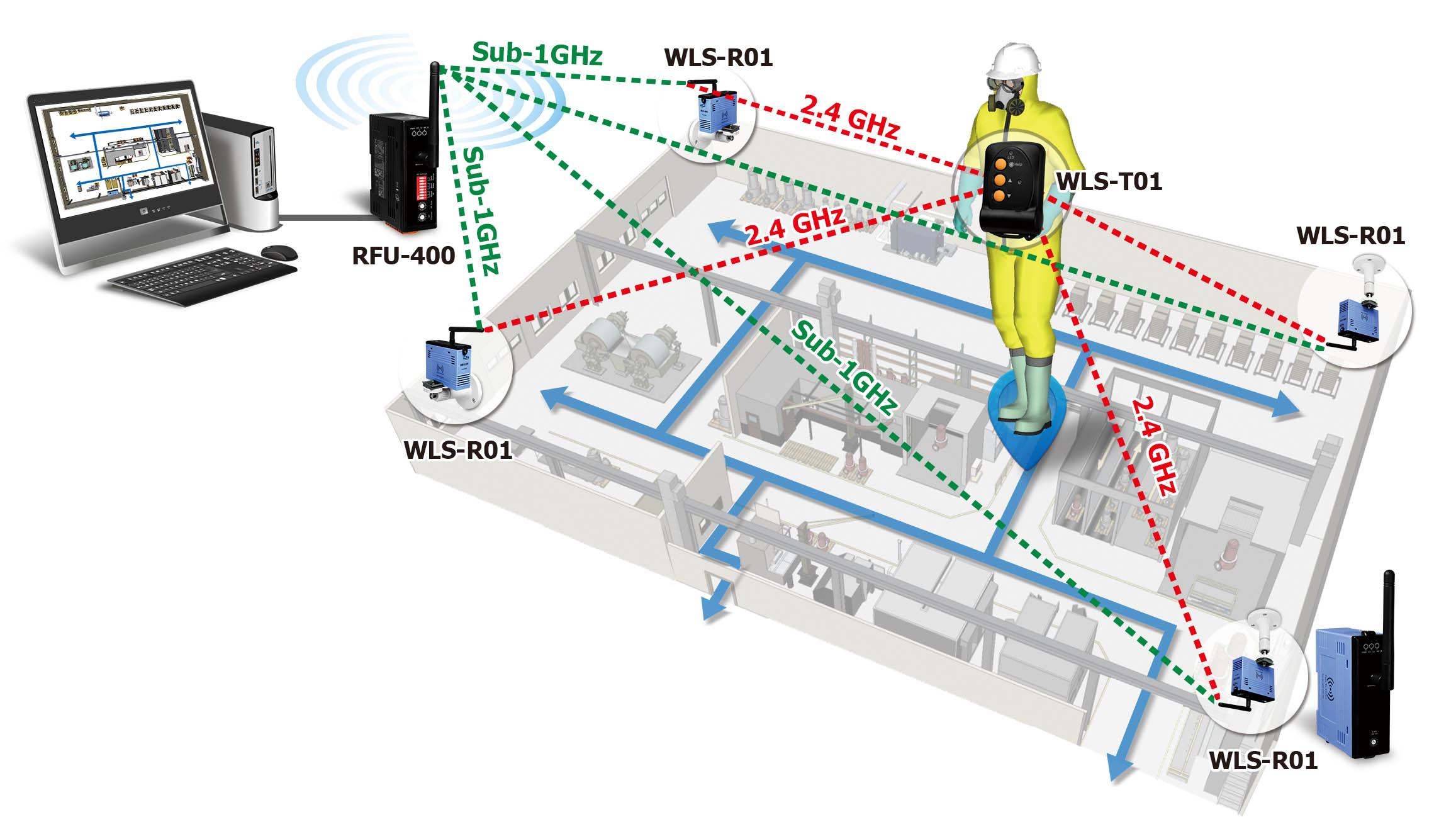 WLS-R01 is a 2.4GHz wireless receiver, it is mainly installed in fixed position to receive the 2.4GHz wireless Locating data of WLS-T01 broadcast. In the other hand, WLS-R01 is also a wireless converter (called Router) from 2.4GHz to 400MHz. it can effectively use 400MHz high transmittance characteristics to extend the wireless transmission distance, and don't need add wire between the communication paths. The WLS software in the PC can use transparent function of RFU-400 to poll the wireless Locating data of WLS-T01, and then calculate the relative position of WLS-T01 by the algorithm. WLS-R01 include two wireless frequency, one is ISM 2.4GHz global common frequency band total have 16 channels, the range of 16 channels are 2.405GHz to 2.48GHz, it can separated into 5MHz segments, and the wireless transmission range (line of sight, LOS) is 100 meters; the other is 400MHz frequency band total have 16 channels, the range of 16 channels are 429.1750MHz to 429.2375MHz and 429.8125 MHz to 429.9250 MHz, and the wireless transmission range (line of sight, LOS) is 500 meters. In addition, the user can divide four groups ID in the each 400MHz channel to avoid adjacent channels affect each other. The user can simply use the DIP switch and rotation switch to configure the parameter, and don't need to add wire between the communication paths, that can speed up to build the system, and reduce the cost, so it very suitable for use in item tracking, personnel movements, factory regional management and other applications.